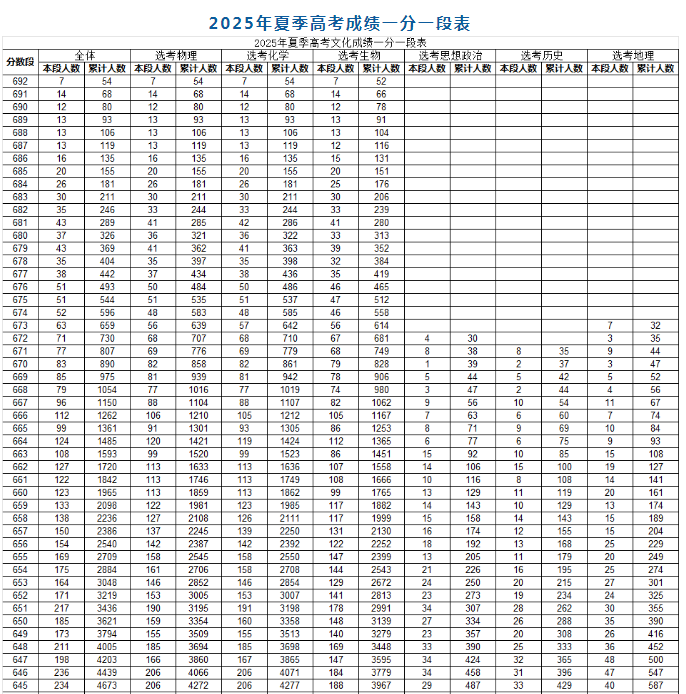 在这个表格当中,我们会看到这样的一些信息,比如说多少分,左列是分值,后边就是总人数,也就是全体的人数,指的就是这个分先是本段人数,然后是一个累积人数。举个例子,2025年的一分一段表中680分,本段人数有37人,累积人数有326人,意思就是说680分以上的一共有326个学生。通过这样一个数据,我们就能够很容易知道高分段、中分段、低分段,或者说特殊类型提档线之上、一段线之上到底是多少人。