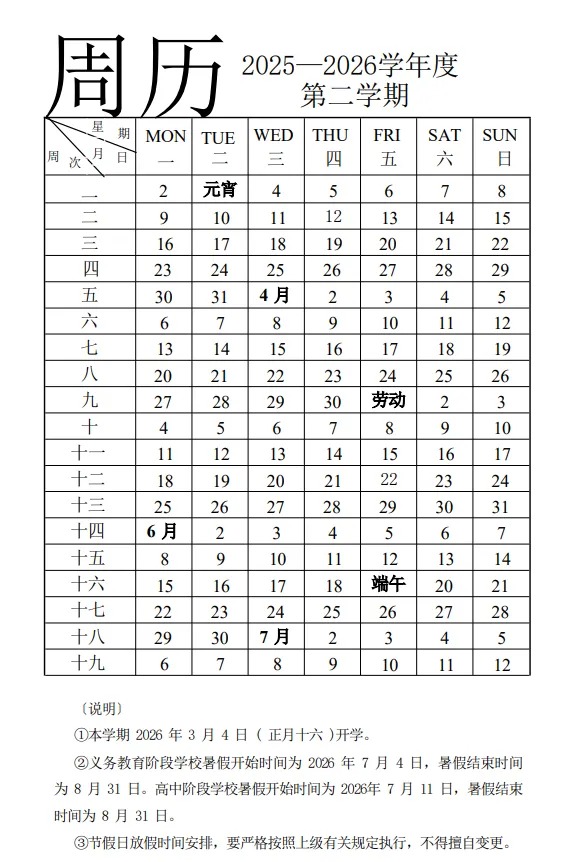 寒假开始时间为2026年2月10日(腊月廿三),寒假结束时间为3月3日(正月十五)。