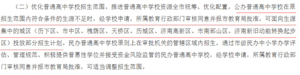 (二)优化普通高中学校招生范围。推进普通高中学校资源全市统筹、优化配置。公办普通高中学校在原招生范围内符合条件的生源不足时,经学校申请,所属教育行政部门审核同意并报市教育局批准,可面向生源集中的城区(历下区、市中区、槐荫区、天桥区、历城区、济南高新区、市南部山区、济南新旧动能转换起步区)投放部分招生计划。民办普通高中学校原则上在审批机关的管辖区域内招生,通过市级民办中小学办学评估、管理规范、积极提供普惠性学位并接受资金风险监管的民办普通高中学校,经学校申请,所属教育行政部门审核同意并报市教育局批准,可适当调整招生范围。
