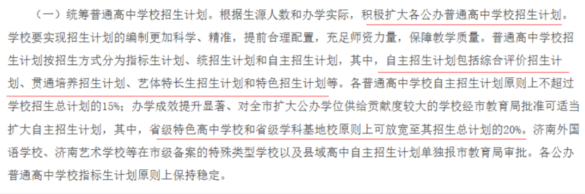 (一)统筹普通高中学校招生计划。根据生源人数和办学实际,积极扩大各公办普通高中学校招生计划。学校要实现招生计划的编制更加科学、精准,提前合理配置,充足师资力量,保障教学质量。普通高中学校招生计划按招生方式分为指标生计划、统招生计划和自主招生计划,其中,自主招生计划包括综合评价招生计划、贯通培养招生计划、艺体特长生招生计划和特色招生计划等。各普通高中学校自主招生计划原则上不超过学校招生总计划的15%;办学成效提升显著、对全市扩大公办学位供给贡献度较大的学校经市教育局批准可适当扩大自主招生计划,其中,省级特色高中学校和省级学科基地校原则上可放宽至其招生总计划的20%。济南外国语学校、济南艺术学校等在市级备案的特殊类型学校以及县域高中自主招生计划单独报市教育局审批。各公办普通高中学校指标生计划原则上保持稳定。