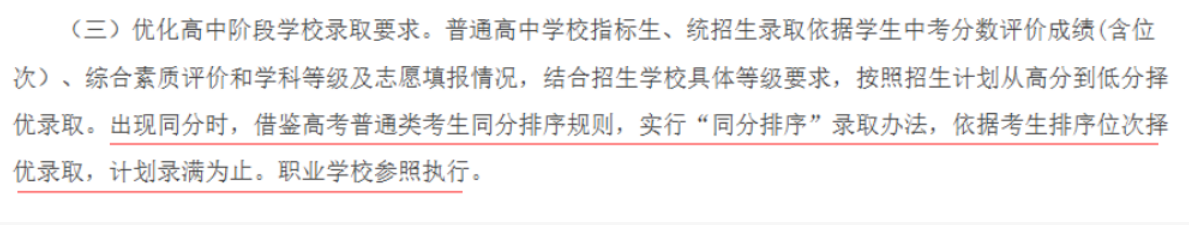 (三)优化高中阶段学校录取要求。普通高中学校指标生、统招生录取依据学生中考分数评价成绩(含位次)、综合素质评价和学科等级及志愿填报情况,结合招生学校具体等级要求,按照招生计划从高分到低分择优录取。出现同分时,借鉴高考普通类考生同分排序规则,实行“同分排序”录取办法,依据考生排序位次择优录取,计划录满为止。职业学校参照执行。