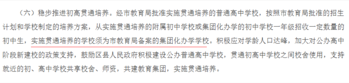 (六)稳步推进初高贯通培养。经市教育局批准实施贯通培养的普通高中学校,按照市教育局批准的招生计划和学校制定的培养方案,从实施贯通培养的附属初中学校或集团化办学的初中学校一年级招收一定数量的初中生,实施贯通培养的学校须为市教育局备案的集团化办学学校。积极应对学龄人口达峰,加大对公办高中阶段新建校的政策支持,鼓励区县人民政府积极建设公办普通高中学校,贯通初高中学校之间校舍使用,支持就近的初、高中学校共享校舍、师资,共建教育集团,实施贯通培养。