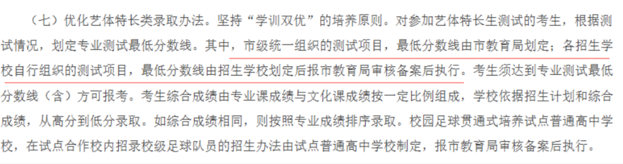 (七)优化艺体特长类录取办法。坚持“学训双优”的培养原则。对参加艺体特长生测试的考生,根据测试情况,划定专业测试最低分数线。其中,市级统一组织的测试项目,最低分数线由市教育局划定;各招生学校自行组织的测试项目,最低分数线由招生学校划定后报市教育局审核备案后执行。考生须达到专业测试最低分数线(含)方可报考。考生综合成绩由专业课成绩与文化课成绩按一定比例组成,学校依据招生计划和综合成绩,从高分到低分录取。如综合成绩相同,则按照专业成绩排序录取。校园足球贯通式培养试点普通高中学校,在试点合作校内招录校级足球队员的招生办法由试点普通高中学校制定,报市教育局审核备案后执行。