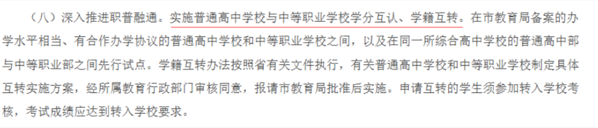 (八)深入推进职普融通。实施普通高中学校与中等职业学校学分互认、学籍互转。在市教育局备案的办学水平相当、有合作办学协议的普通高中学校和中等职业学校之间,以及在同一所综合高中学校的普通高中部与中等职业部之间先行试点。学籍互转办法按照省有关文件执行,有关普通高中学校和中等职业学校制定具体互转实施方案,经所属教育行政部门审核同意,报请市教育局批准后实施。申请互转的学生须参加转入学校考核,考试成绩应达到转入学校要求。