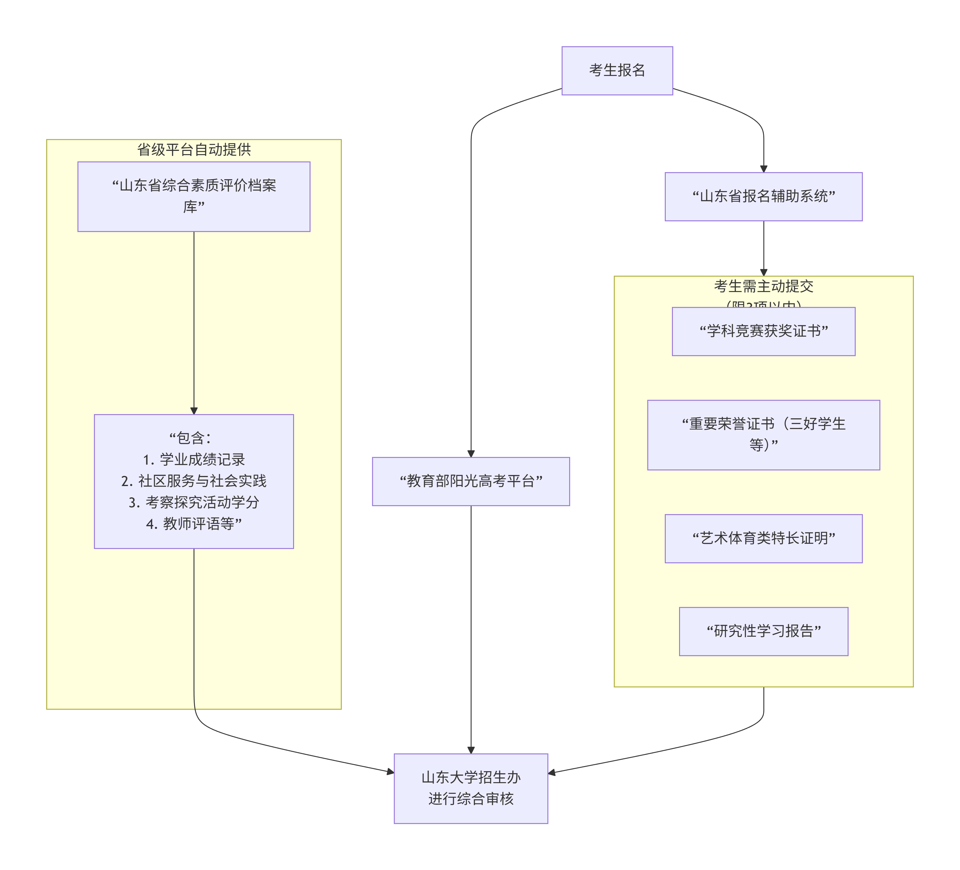 山东大学2025年综合评价招生简章在“报名程序”中明确说明,学校将对考生的报名材料及“山东省教育行政部门提供的考生高中综合素质评价信息”进行审核。这意味着,考生在“山东省教育招生考试院综合评价招生报名辅助系统”中完成报名后,省教育招生考试院会直接将所有报考考生的全省统一格式的综合素质档案,批量提供给山东大学进行审核。