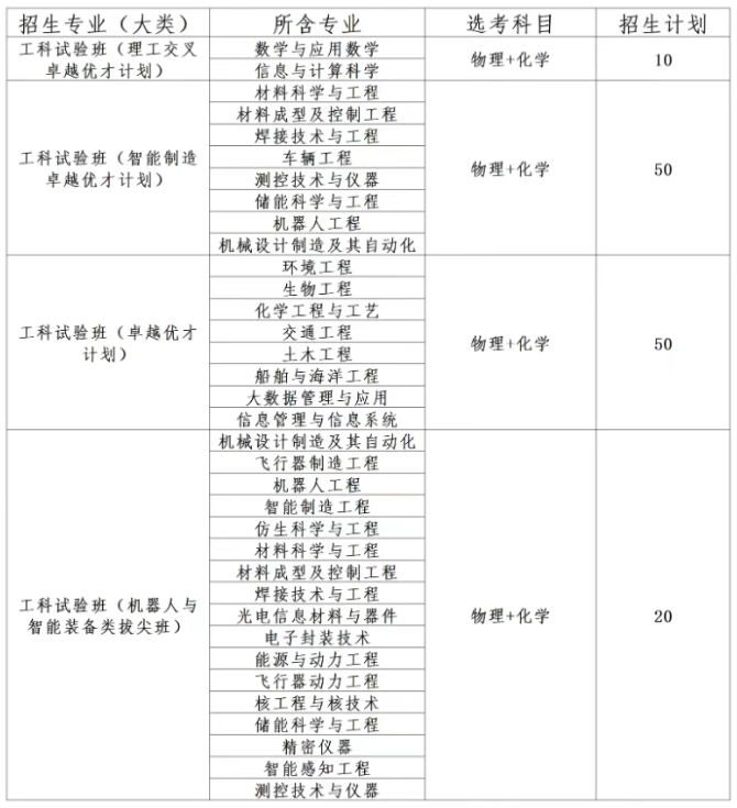 哈尔滨工业大学在山东省综合评价招生计划为130人,招生专业为工科试验班(理工交叉卓越优才计划)、工科试验班(智能制造卓越优才计划)、工科试验班(卓越优才计划)、工科试验班(机器人与智能装备类拔尖班)。采用大类招生模式,录取考生可在被录取工科试验班所含专业内任选专业,选择专业时间以教务部门公布时间为准。详见下表: