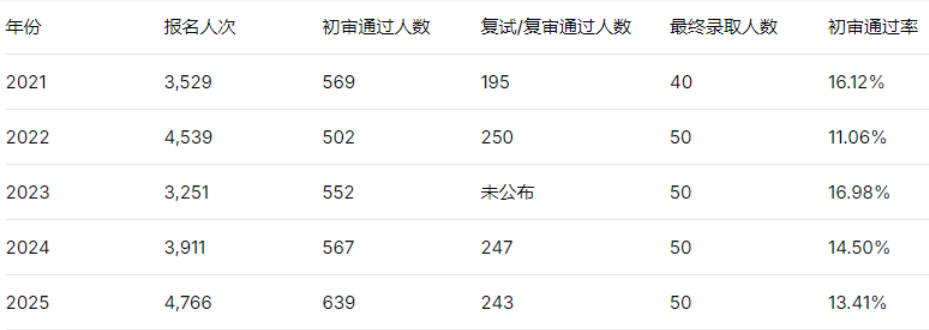中国海洋大学近几年招生计划人数变化不大,但报名人次基本呈波动上升,初审通过率在2022年明显下降后,近三年已稳定在13%-17%区间,筛选标准趋于明朗。