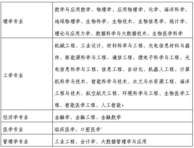 学校2025年拟按照物理学、化学、材料科学与工程、生物科学、生物技术、生物医学工程、电子信息工程、计算机科学与技术、数学与应用数学、管理科学、工业设计、外国语言与外国历史共12个本科专业招录学生。学校在高考录取阶段满足所有被录取考生的第一专业志愿,入学后为符合条件的学生提供公开公正的再次选择专业的机会。
