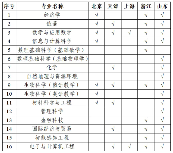 在北京、天津、上海、浙江、山东各省(直辖市)计划招生专业如下,表中“√”表示该省份有此招生专业。