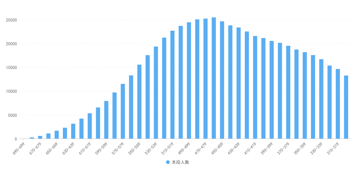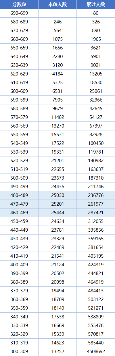 其中人数最多的是460-469分数段,有25444人;人数最少的是690及以上分数段,仅有80人。
