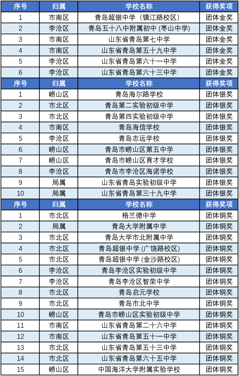 初三团体奖:6所初中获得团体金奖(市南区3所,李沧区3所),10所初中获得团体银奖(崂山区3所,局属校2所,市南区1所,李沧区2所,市北区2所),15所初中获得团体铜奖(局属校1所,市南区2所,市北区8所,李沧区2所,崂山区2所)