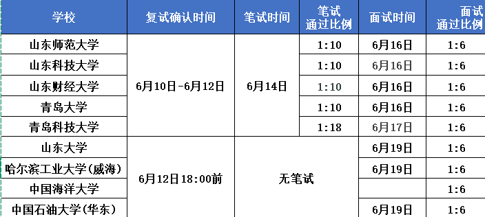 各院校复试确认、笔试及面试具体安排: