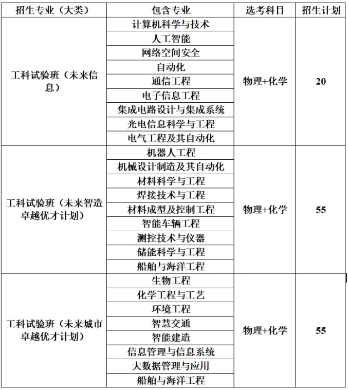 新增:工科试验班(未来信息)20人 增加:未来智造卓越优才计划55人(+5);未来城市卓越优才计划55人(+5)