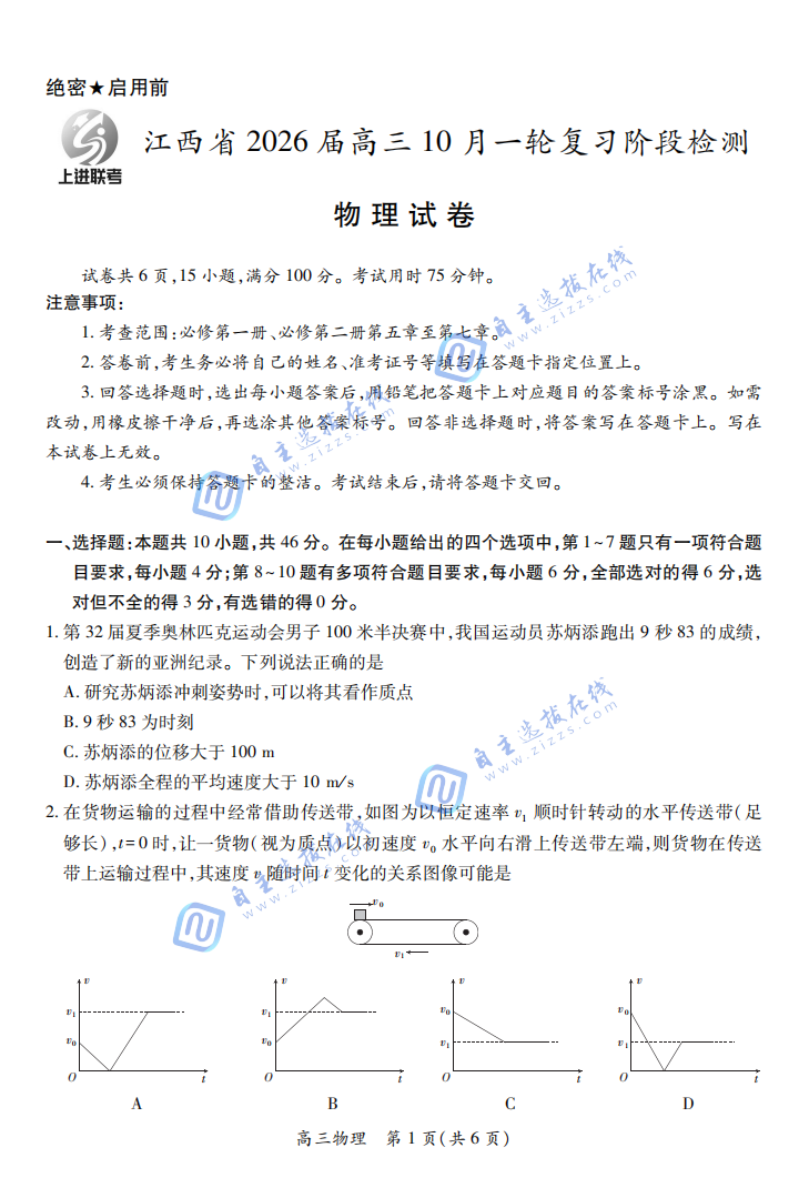 江西上进稳派2026届高三10月一轮复习阶段检测已于10月9日开考。本次检测聚焦力学与运动学等核心主干知识,试题命制突出对物理概念本质的理解、物理规律的深度把握以及模型建构能力的考查。自主选拔在线团队特整理了江西上进稳派2026届高三10月一轮复习阶段检测物理试题及答案。欢迎考生收藏,下载!