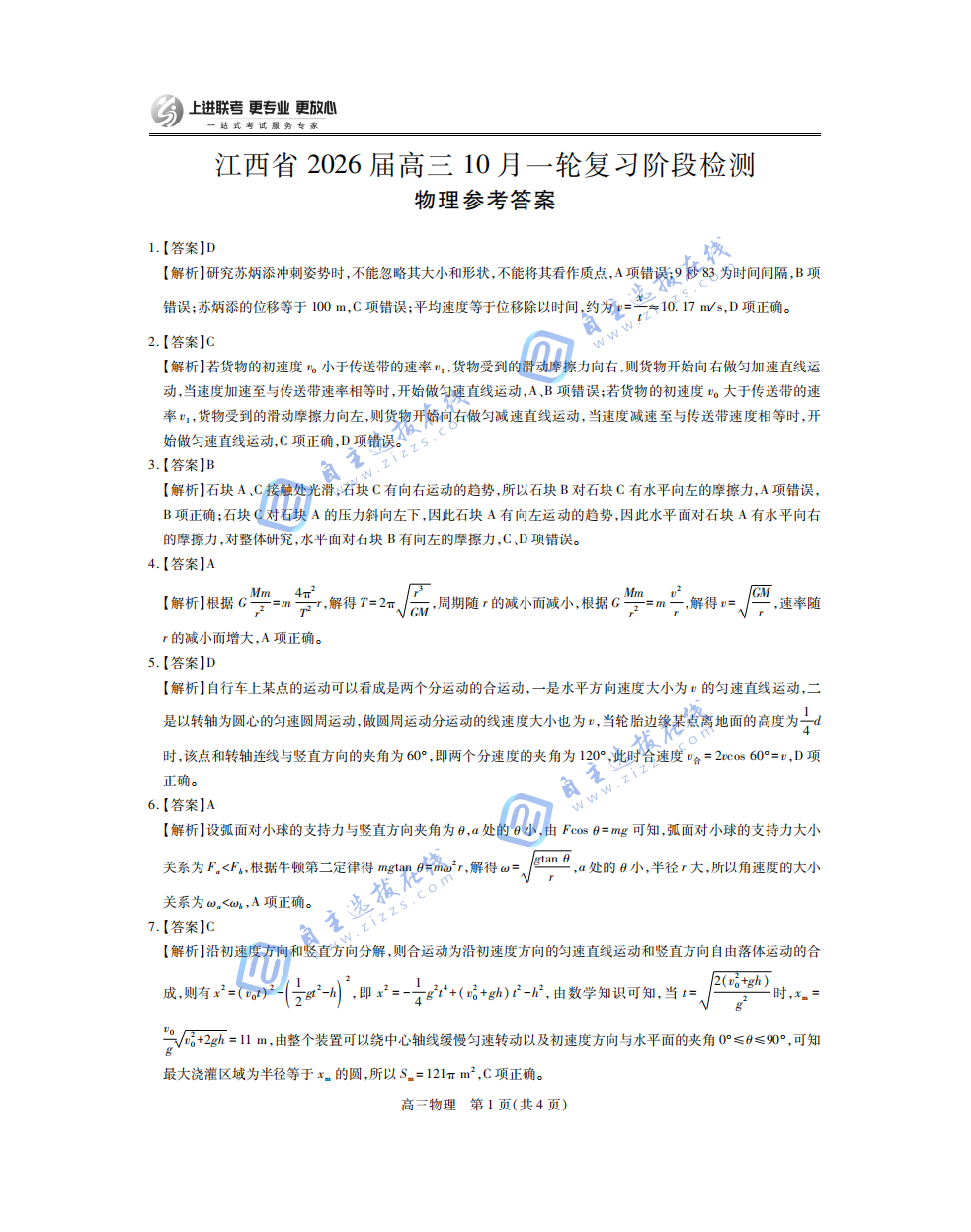 江西上进稳派2026届高三10月一轮复习阶段检测物理试题及答案