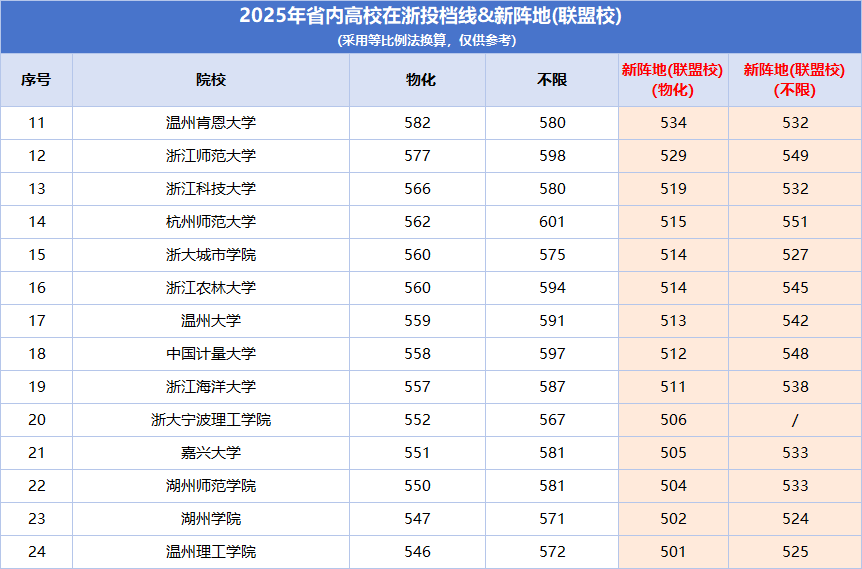 根据等比例法来换算,新阵地联盟物化考生520+可以选择浙江科技大学等校;非物化考生520+可以选择绍兴文理学院等校。以下是部分院校换算分数线,供大家参考