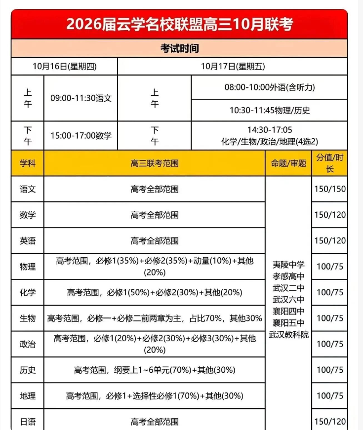 本次考试由夷陵中学、孝感高中、武汉二中、武汉六中、襄阳四中、襄阳五中及武汉市教育科学研究院等多所名校与专业机构联合参与命题与审题,旨在为高三学生提供一次高规格、高质量的阶段性诊断。