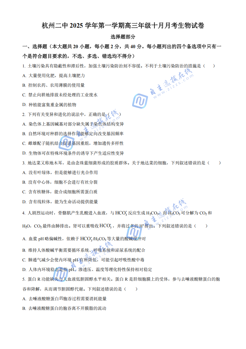 浙江省杭州市第二中学2026届10月月考生物科目近日考试!本试题着重考查学生对遗传、代谢、生命活动调节等核心概念的深层理解及图文信息转换能力,情境设计贴近科研前沿。自主选拔在线团队整理浙江省杭州市第二中学2026届10月月考生物试题及答案相关内容,一起来看!