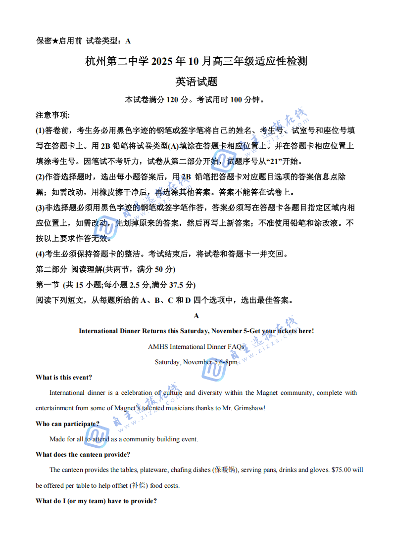 浙江省杭州市第二中学2026届10月月考英语科目近日考试!试题紧扣高考大纲,在阅读理解、完形填空及书面表达等部分均体现了对语言综合应用能力的高要求。通过练习本次试卷,考生可有效检验词汇掌握度、长难句分析能力及写作水平。自主选拔在线团队整理浙江省杭州市第二中学2026届10月月考英语试题及答案相关内容,一起来看!