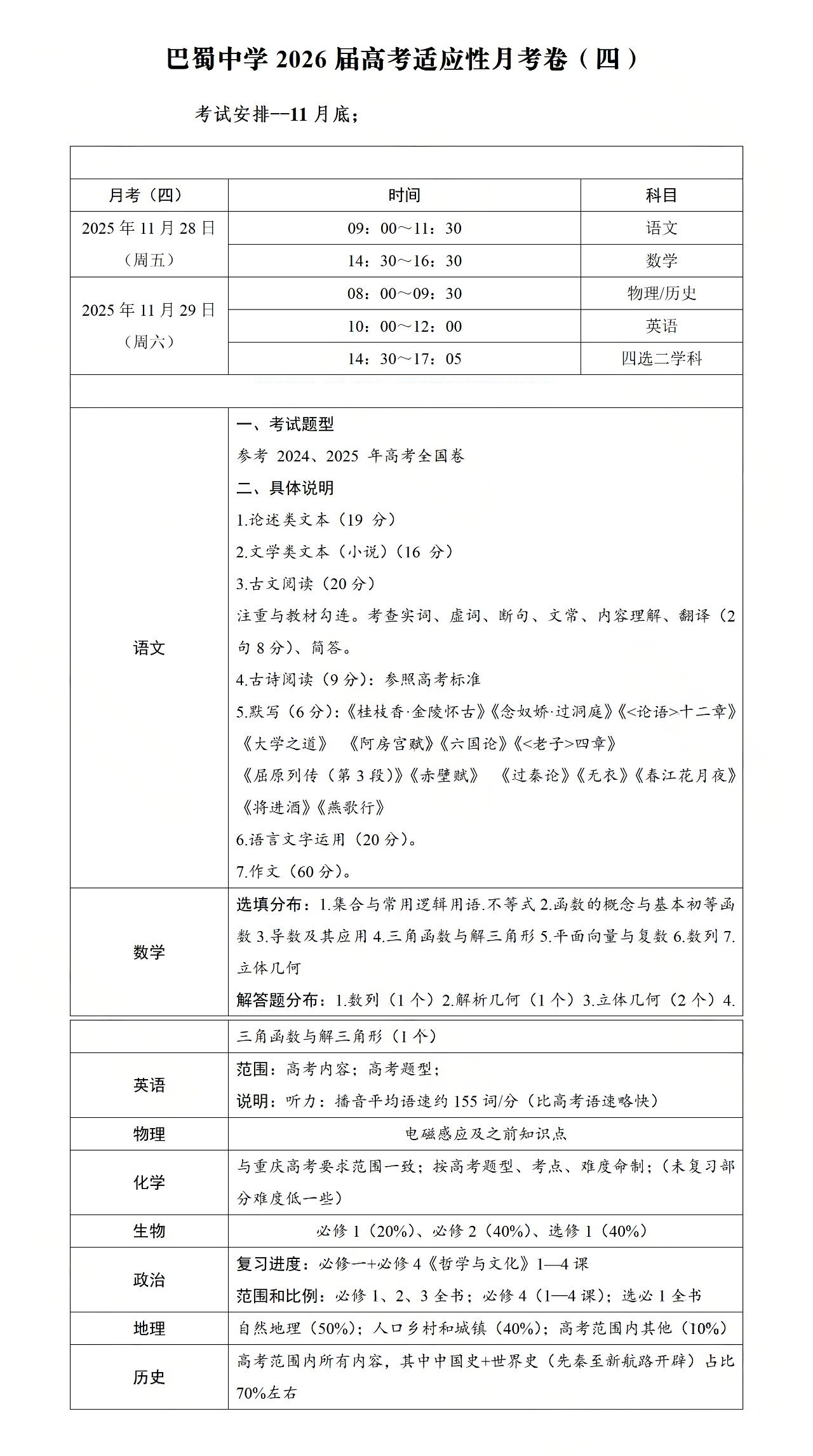 重庆市巴蜀中学2026届高三11月期中考试时间及范围公布
