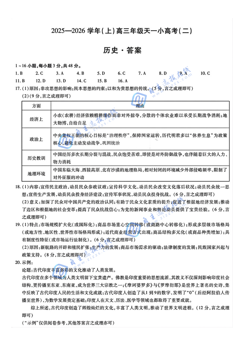 天一大联考2026届高三天一小高考(二)历史试题及答案