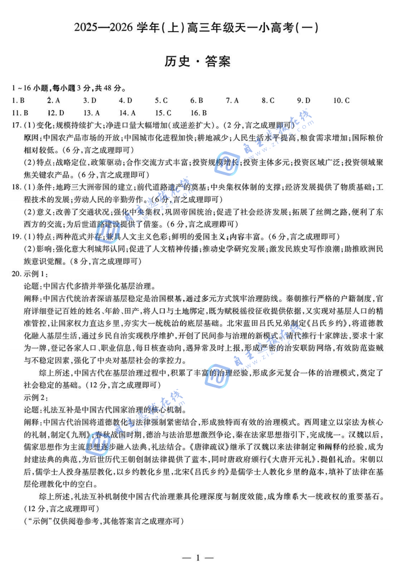 山西省2025-2026学年(上)高三年级天一小高考(一)历史试题及答案