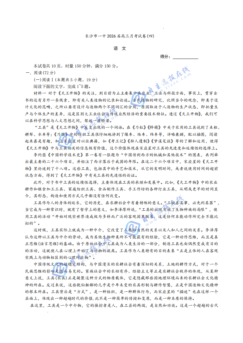 炎德·英才大联考长沙市一中2026届高三月(四)已于近日开考,语文试题已重磅出炉,试题严格遵循新课标要求,涵盖现代文阅读、古诗文鉴赏及写作等模块,题型新颖灵活,着重考查学生的文本解读深度与批判性思维。为方便广大师生下载练习与考后复盘,自主选拔在线团队特整理并提供高清PDF电子版,内含完整试题与权威解析,助你精准把脉复习方向,有效提升语文应试水平。