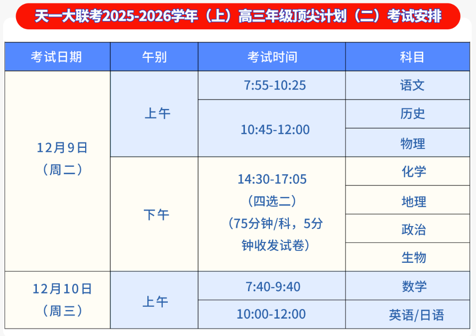 天一大联考2026届高三年级顶尖计划(二)联考安排