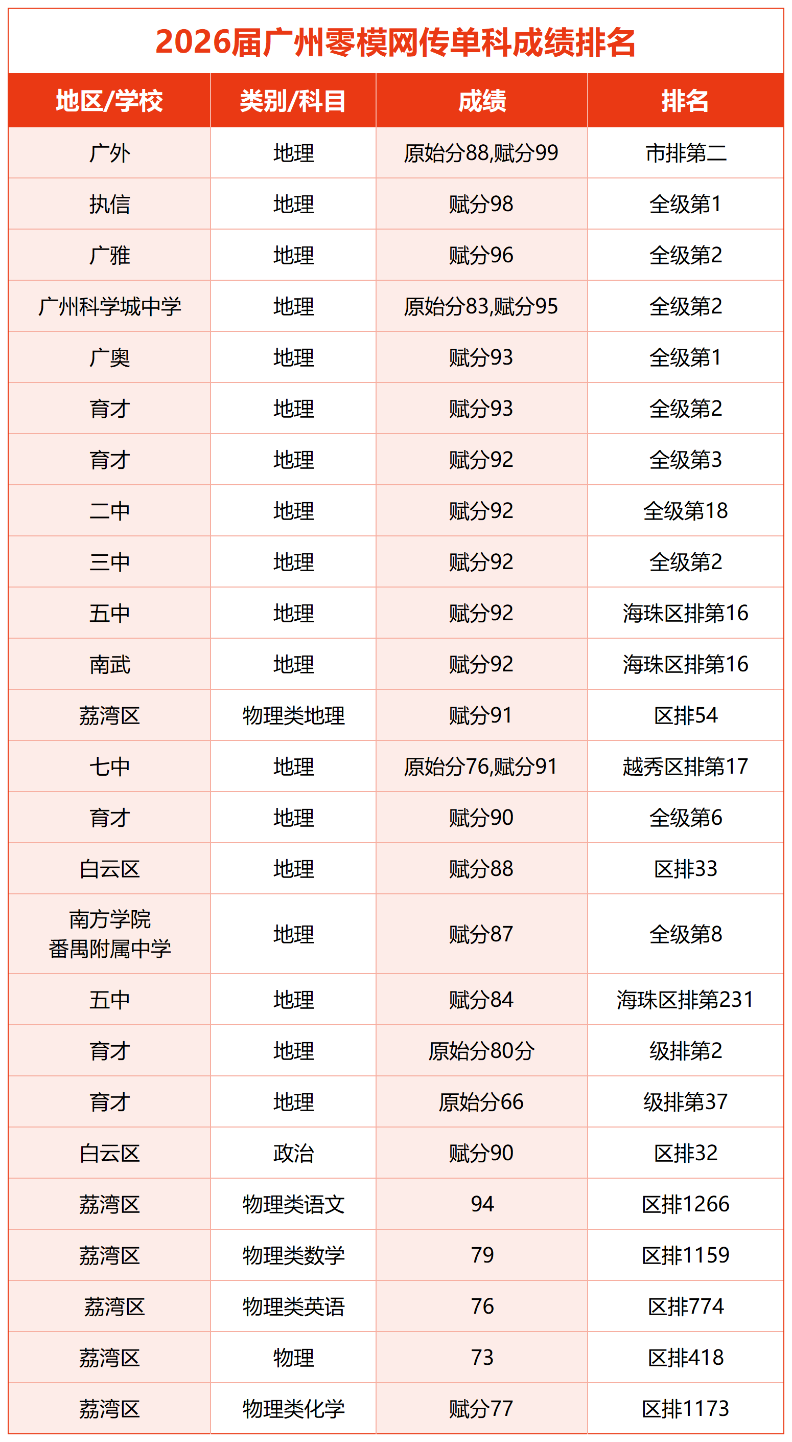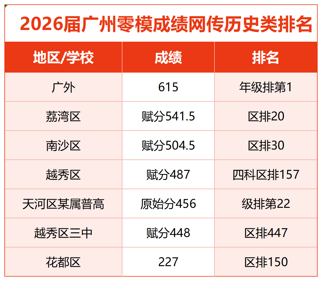 网传2026广州零模全市前15名成绩曝光!2026届广州零模番禺区、天河区、荔湾区区分数线也已公布!自主选拔在线带来2026广州零模成绩排名、各区划线、全市赋分表、各院校预估分数线等内容,一起来看看吧!