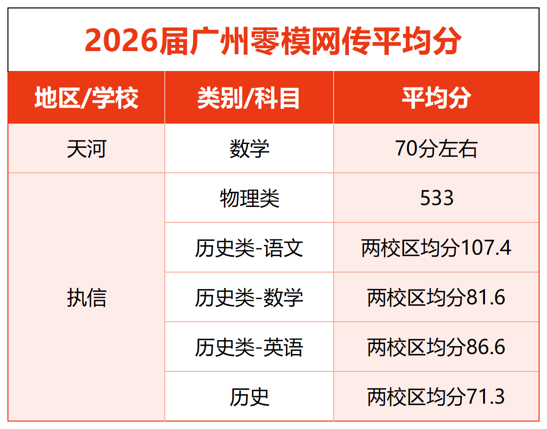 从目前收集到的平均分情况来看,天河区数学平均分在70分上下,执信中学物理类均分为533分,历史类的语文均分则达到了107.4分。