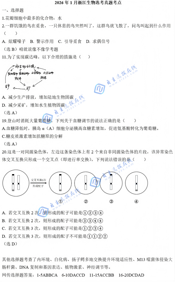 浙江省2026年1月高三选考(首考)以于2026年1月6日正式开始!2026年1月浙江选考生物科目考试已经考试结束。考生们觉得生物难易程度怎么样呢?自主选拔在线团队收集整理了考生分享的生物试题及答案讨论,一起来看~
