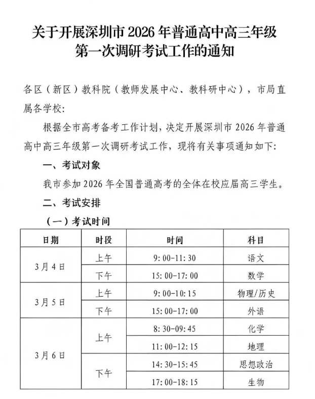 深圳2026届高三第一次调研考试时间已正式敲定,备受关注的考试将于3月4日至6日隆重举行,这不仅是对高三学子一轮复习成果的重要检验,也为大家后续备考提供了关键参考。本次调研考试的科目安排、时间分布及考点设置等具体详细安排均已出炉,信息全面,助力考生科学规划备考节奏。快来和自主选拔在线团队一起看看吧,掌握第一手资讯,为冲刺理想大学打下坚实基础!