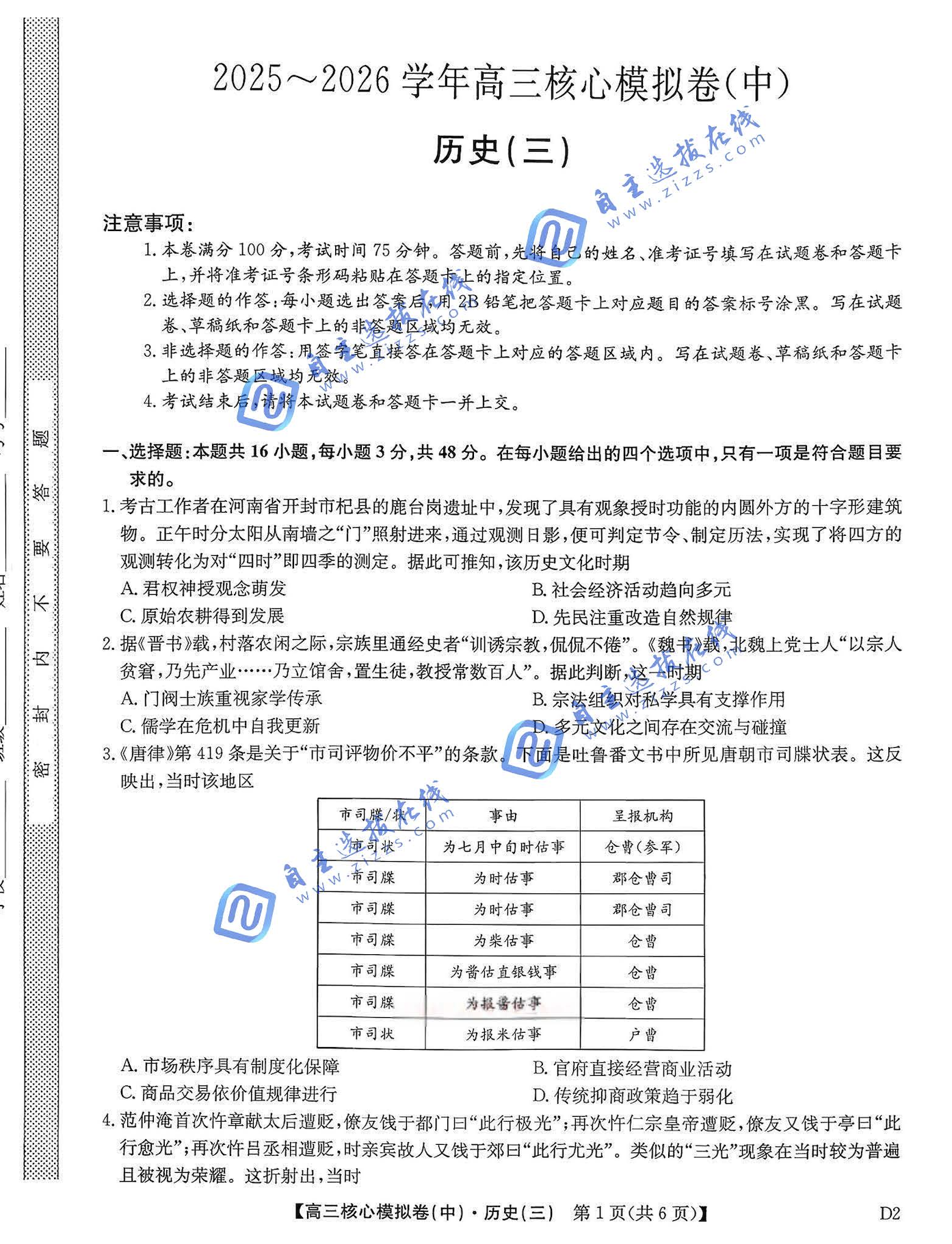 九师联盟2026届高三核心模拟卷(中)三历史试题及答案