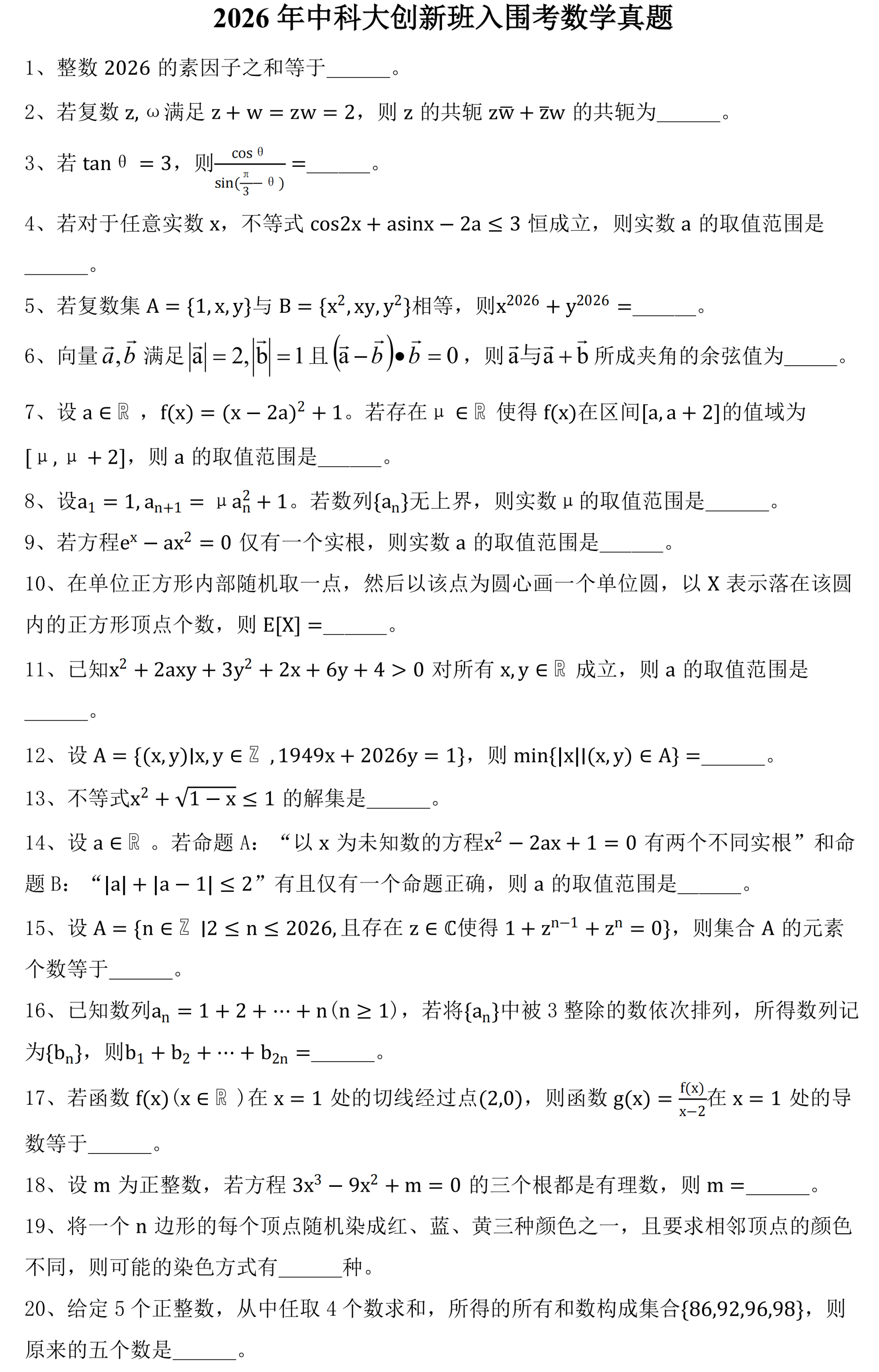 2026年中国科学技术大学创新试点班入围考核数学科目试题出炉,大家觉得此次试题难度如何?题型有哪些?自主选拔在线团队为大家整理了本次数学试题,大家可以一起来对照练习!