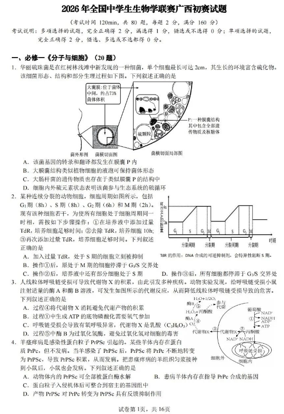 2026年全国中学生生物学联赛广西初赛考核已经结束,那么,此次试题考察了哪些题型?接下来为大家整理此次2026中学生生物学联赛广西赛区的预赛试题内容,供大家进行下载练习!