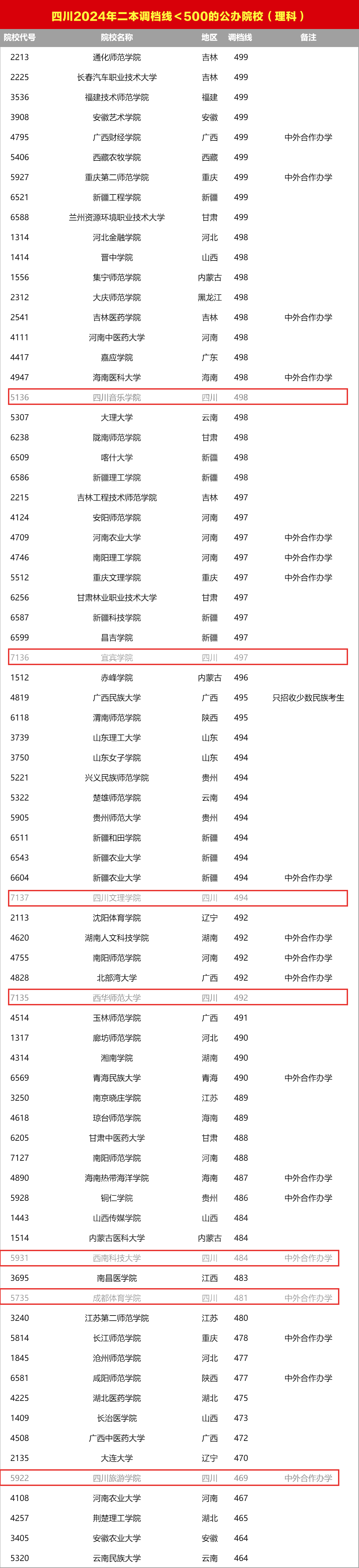 在四川高考二本批次录取中,调档线<500的公办院校代码合计163个(理科76个、文科87个)。其中,来自省内公办院校的招生代码共有15个,在省内外全部招生代码中占比为9.2%。