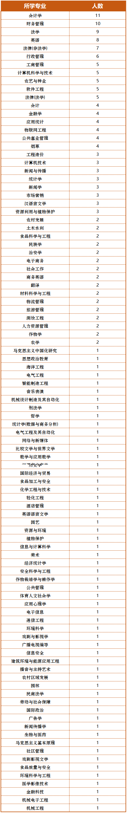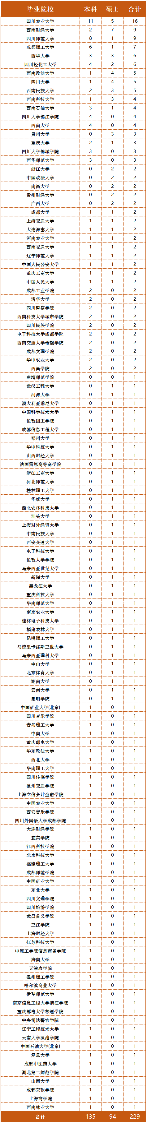 根据统计,省内院校共录取112人,省外院校录取117人。业务操作类岗位录取145人,管理与专业技术类岗位录取84人。从录取学历上看,此次公布名单全部为本科和硕士,其中本科录取人数135人,硕士录取人数94人。从录取院校来看,录取来自126个不同的学校。其中16人来自四川农业大学,在所有院校中排名第一。西南财经大学共录取9人,录取人数位列第二;四川师范大学共录取9人,录取人数和西南财经大学相同;成都理工大学共录取7人,录取人数位列第三;西华大学共录取6人,录取人数位列第四;四川轻化工大学共录取6人,录取人数和西华大学相同。此外还有中国政法大学2人、华东政法大学1人,法学类合计24人,清华大学、中国人民大学、浙江大学等985高校也有学生被录取。