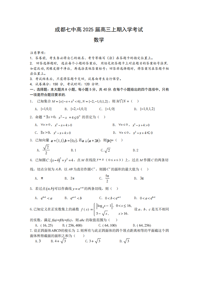 2025届成都七中高三上学期入校考试数学试卷及答案