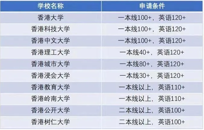 接下来让我们通过一张图纵观看下部分港校的高考成绩要求及对应的英语分数标准:
