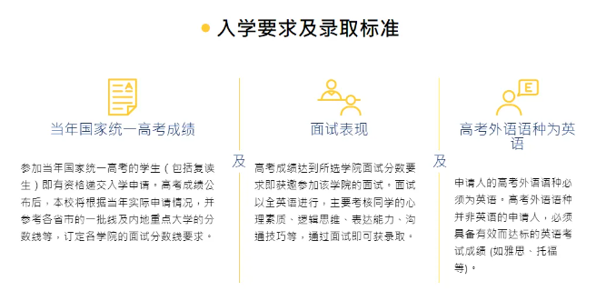 高考成绩达到所选学院面试分数要求即获邀参加该学院的面试。面试以全英语进行,主要考核同学的心理素质、逻辑思维、表达能力、沟通技巧等,通过面试即可获录取。
