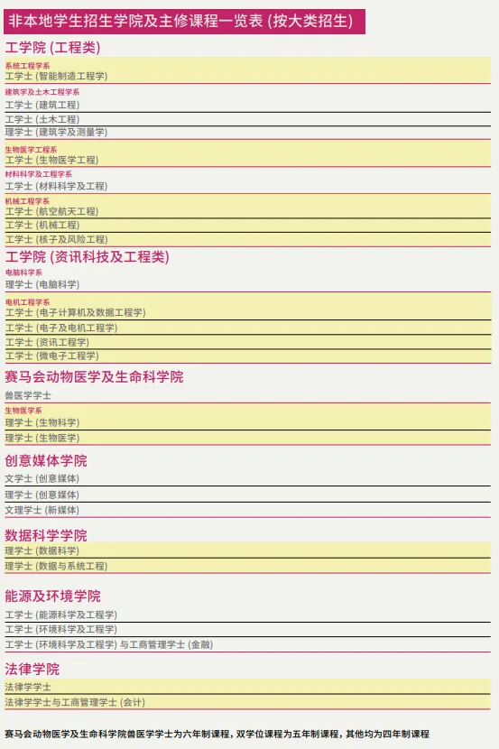 4. 城大在考生报读的学院(专业)志愿之间,不设级差。除非该省、市、自治区采用平行志愿投文件模式,否则报读赛马会动物医学及生命科学院之兽医学学士课程的学生,必须将兽医学学士课程列为首专业志愿,才会被学院考虑。报读法律学院课程的学生则须填报法律学院为首三个专业志愿才会被考虑。其他的招生学院(专业)依各省、直辖市及自治区招生考试机构公布的专业志愿调剂规定进行录取;