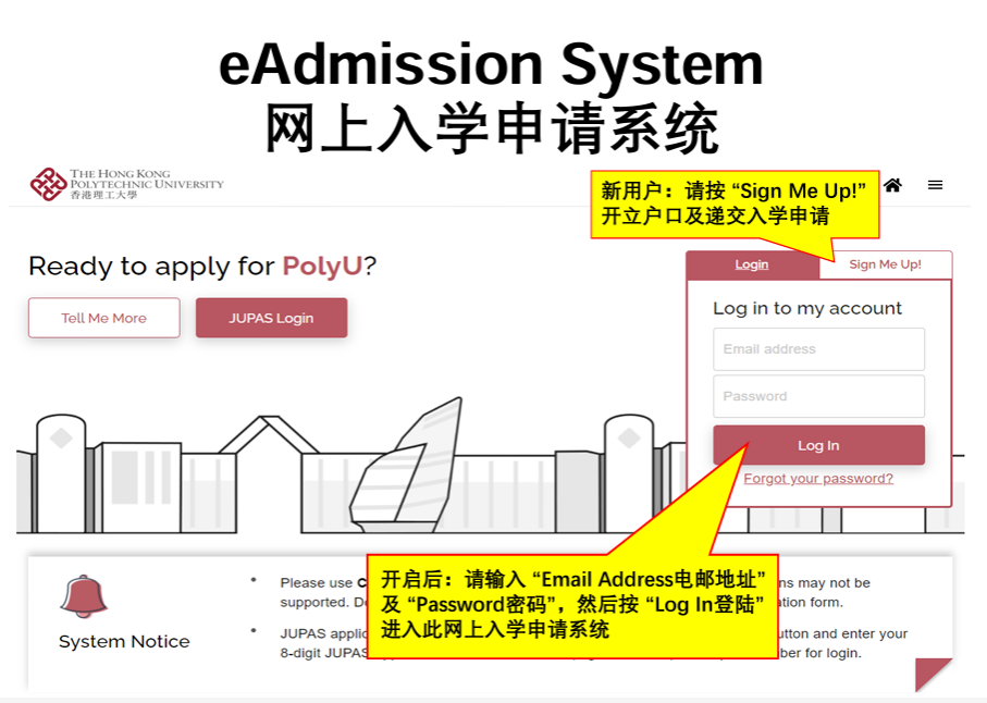 • 进入网上入学申请系统后,按下Sign Me Up! 建立新户口及递交入学申请