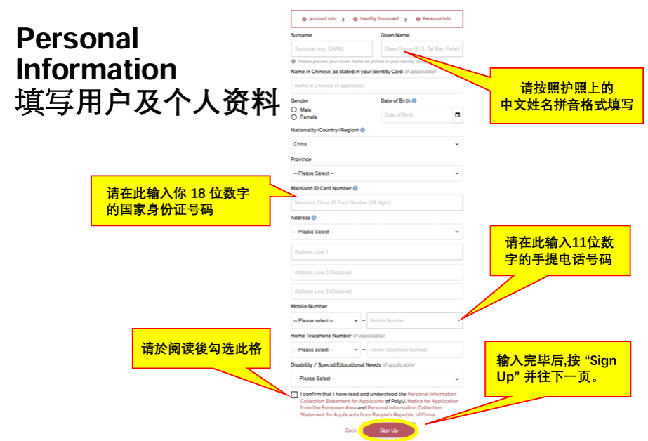 最后请於阅读後勾选此格有关收集申请人的个人资讯,输入完毕后,按“Sign Up” 并往下一页。