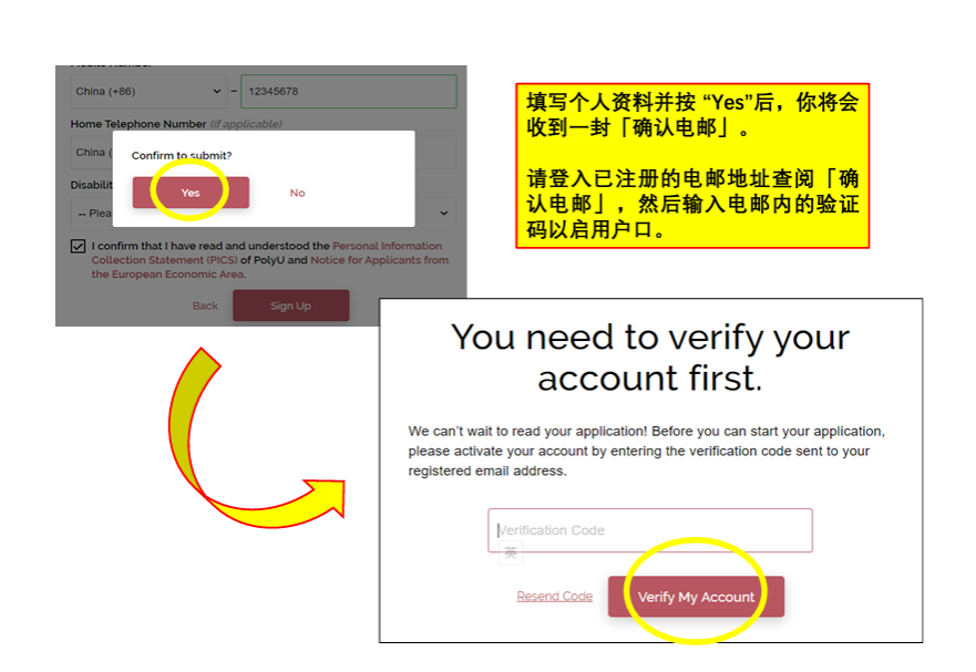 • 填写个人资料并按“Yes”后,你将会收到一封「确认电邮」。请登入已注册的电邮地址查阅「确认电邮」,然后输入电邮内的验证码以启用户口。