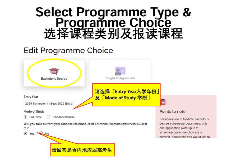 • 请选择「Entry Year入学年份」及「Mode of Study 学制」