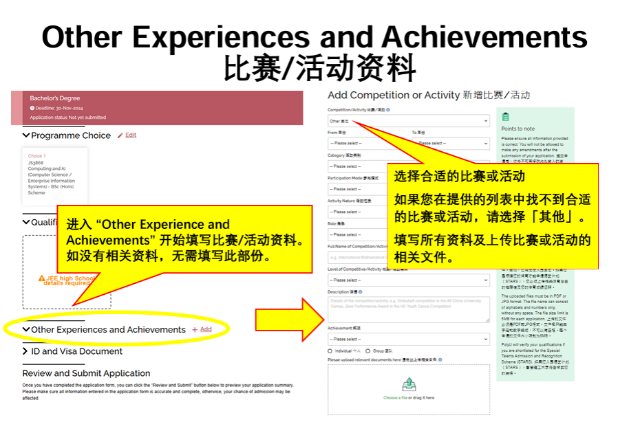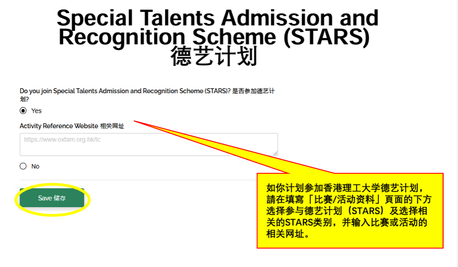 • 如你计划参加香港理工大学德艺计划,請在填寫「比赛/活动资料」頁面的下方选择参与德艺计划(STARS)及选择相关的STARS类别,并输入比赛或活动的相关网址。
