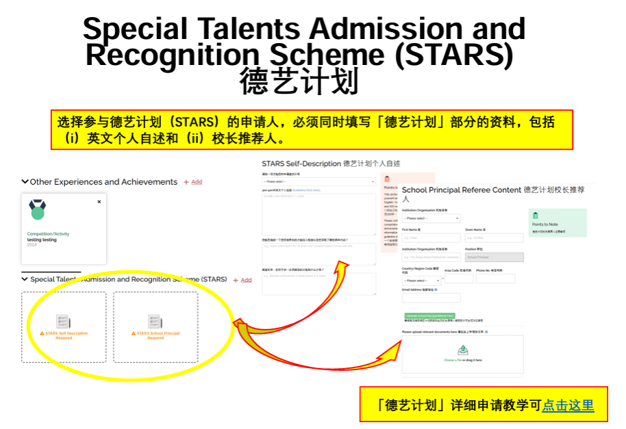 • 选择参与德艺计划(STARS)的申请人,必须同时填写「德艺计划」部分的资料,包括(i)英文个人自述和(ii)校长推荐人。