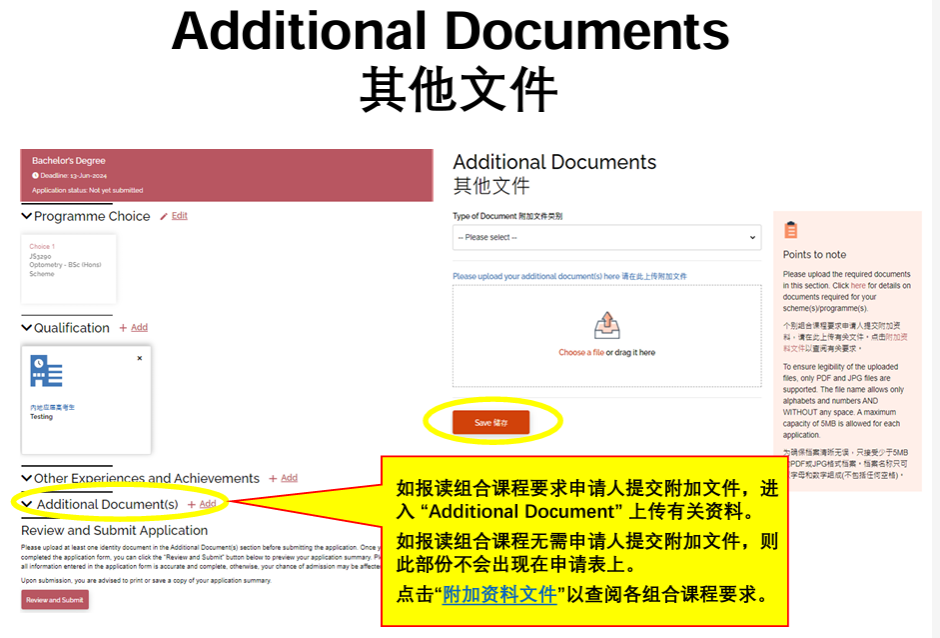 • 如报读组合课程要求申请人提交附加文件,进入“Additional Document” 上传有关资料。