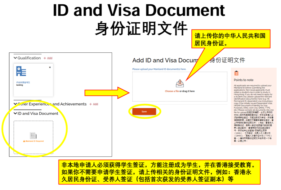 非本地申请人必须获得学生签证,方能注册成为学生,并在香港接受教育。如果你不需要申请学生签证,请上传相关的身份证明文件,例如:香港永久居民身份证、受养人签证(包括首次获发的受养人签证副本)等