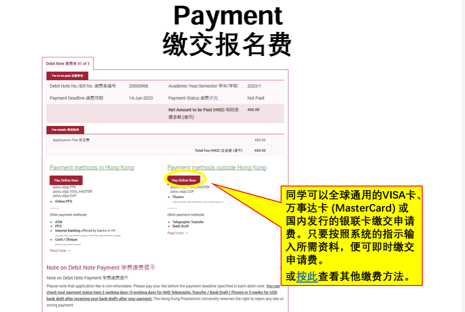 • 请按Payment methods outside Hong Kong, Pay Online Now缴交港币$450元的申请费